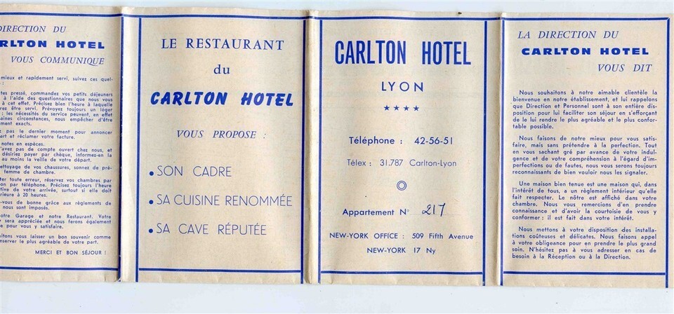 Carlton Hotel Lyon France Brochure with Maps 1950's