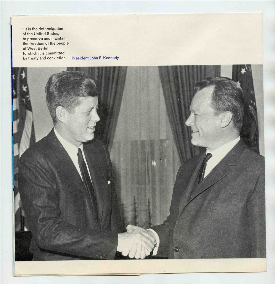 A 12 panel fold out brochure in English. Berlin Keystone of Germany Keystone of Freedom Brochure. Featuring a photo of President John F Kennedy . Includes Mayor Willy Brandt Message to Visitors at Seattle's Century 21 Exposition