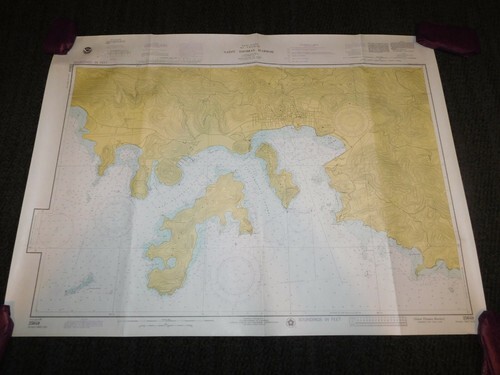 Opens to about 18 1/2" x 28 1/2" and the back is blank. A large The Moorings Virgin Islands Map with inset maps of Road Harbor and Gorda Sound . Circa late 1970's. HAs internal fold tears