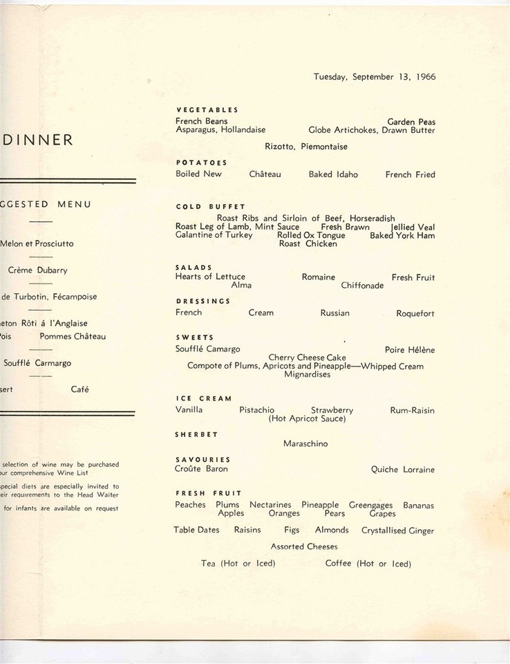 A luncheon menu and a dinner menu from the Cunard Liner R M S Queen Elizabeth, both dated September 13, 1956. In fine condition. The Lunch Menu measures about 8" x 10 1/2" when closed. The cover of the Dinner Menu is Gandria Lake Lugano Switzerland. The Cover of the Luncheopn menu is art by Cecil KennedyTourist Class Menus.