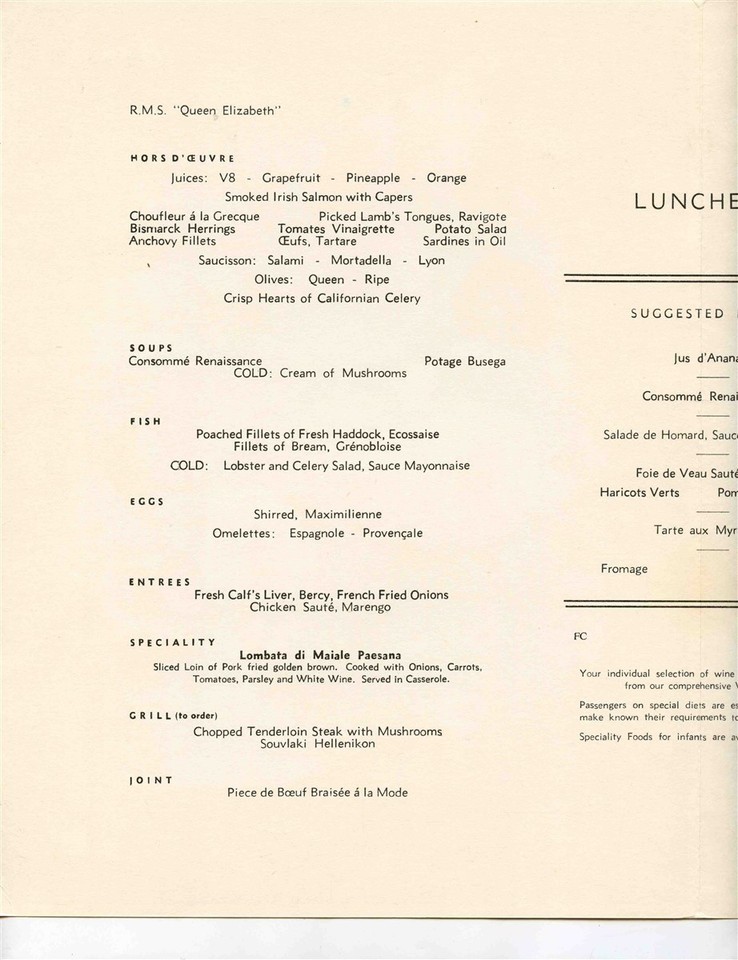 Cunard Line Lunch Dinner Menu Set RMS Queen Elizabeth 1960