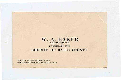 An original card with W A Baker Pleasant Gap Township, Candidate for Sheriff of Bates County Missouri Card. Subject to the Action of the Democratic Party Primary August 7, 1925