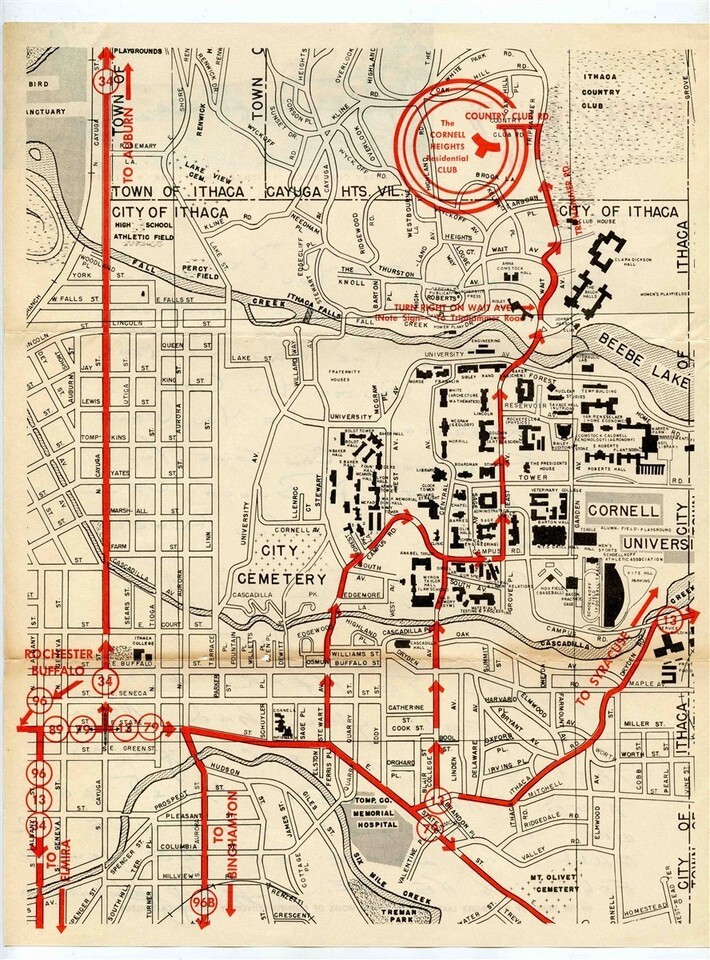 A large 2 sided ( 8 1/2" x 11") single page sheet of stationery with hand written notes on one side and a Cornell University area map on the back. Cornell Heights Residential Club Stationery Map Letter Cornell Ithaca NY . Has an image of the building on the front and location highlighted in RED on the back. The site of a tragic 1967 fire that killed 8 students and a professor . Contains notes to a student from 2 other students about a Fall
