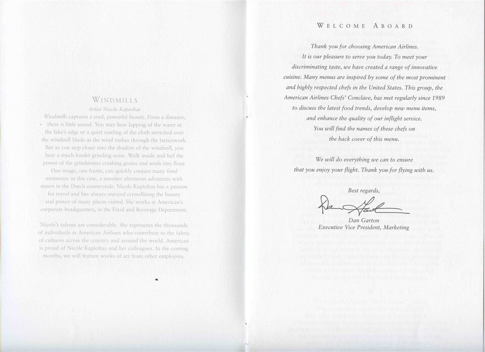 American Airlines Business Class Menu Windmills Cover 2007