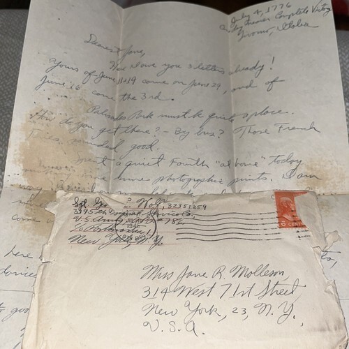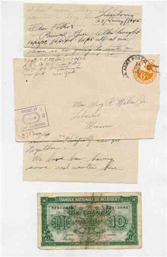 A 2 page letter and envelope written from Luxembourg in January 1945 by a US Army Staff Sergeant to his folks in Missouri with US Army Postal Cancel and Passed by Army Examiner Stamp.. Enclosed in the letter is a DIX 10 Francs note from the Banque Nationale de Belgique.
