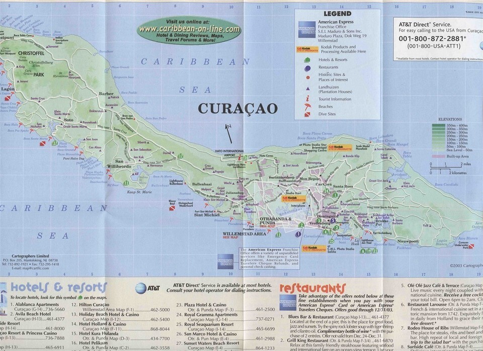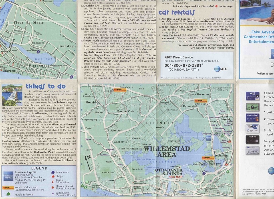 A Pocket Map Curacao by American Express AT T . Opens to about 10 1/4" x 17". Has Island map with information on Hotels and Restaurants on one side and city maps and information on Things to do, Shopping and Car Rentals on the other side. Dated 2003