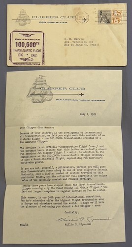 A tri-fold Pan American World Airways Premiere Classe Transatlantic Service Menu. Hand dated 1976. The menu has the seal intact and is in very fine condition. Measures about 8 1/2" x 12" when closed. The seal is gold and has an embossed image of a Clipper Ship. From a London to Washington DC flight