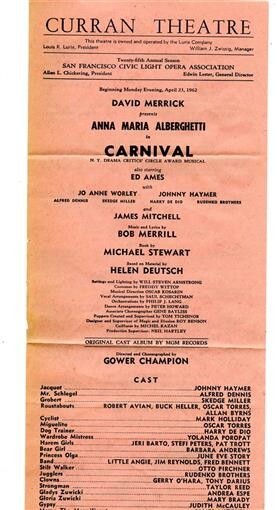 A tall 2 sided Carnival Flyer. Starring Anna Maria Alberghetti, Ed Ames, Jo Anne Worley and Johnny Haymer. At the Curran Theatre in San Francisco in 1962.