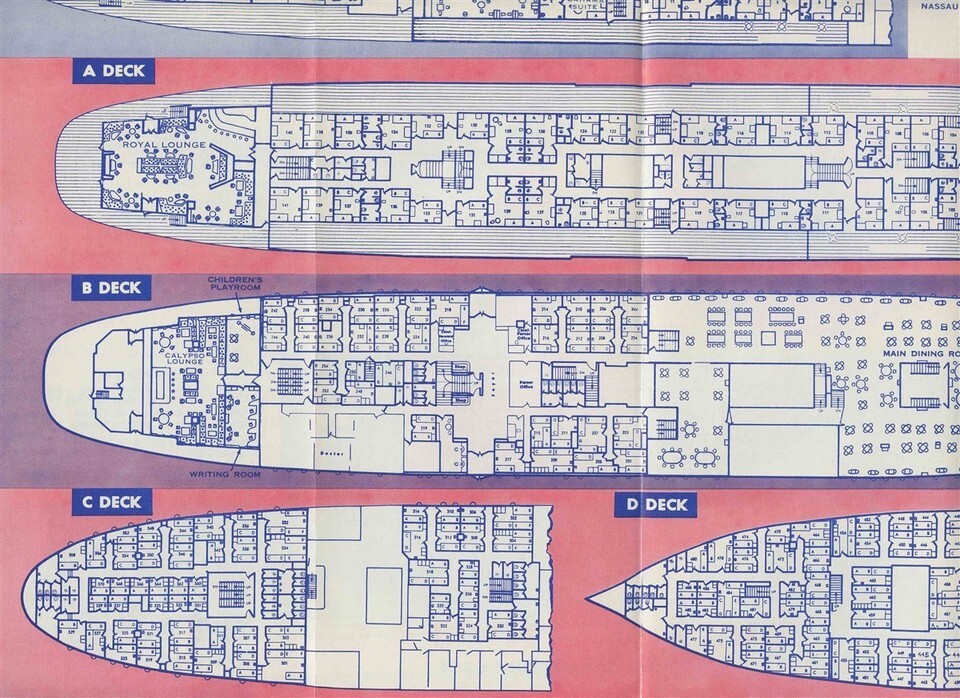 A 16 panel fold out brochure with lots of photos, and travel information, schedule, general information, ship information history, route map, rate chart and large deck plan. Cruise from Miami 1960's Brochure S/S Bahama Star Deck Plan Fares. Dated January 1960