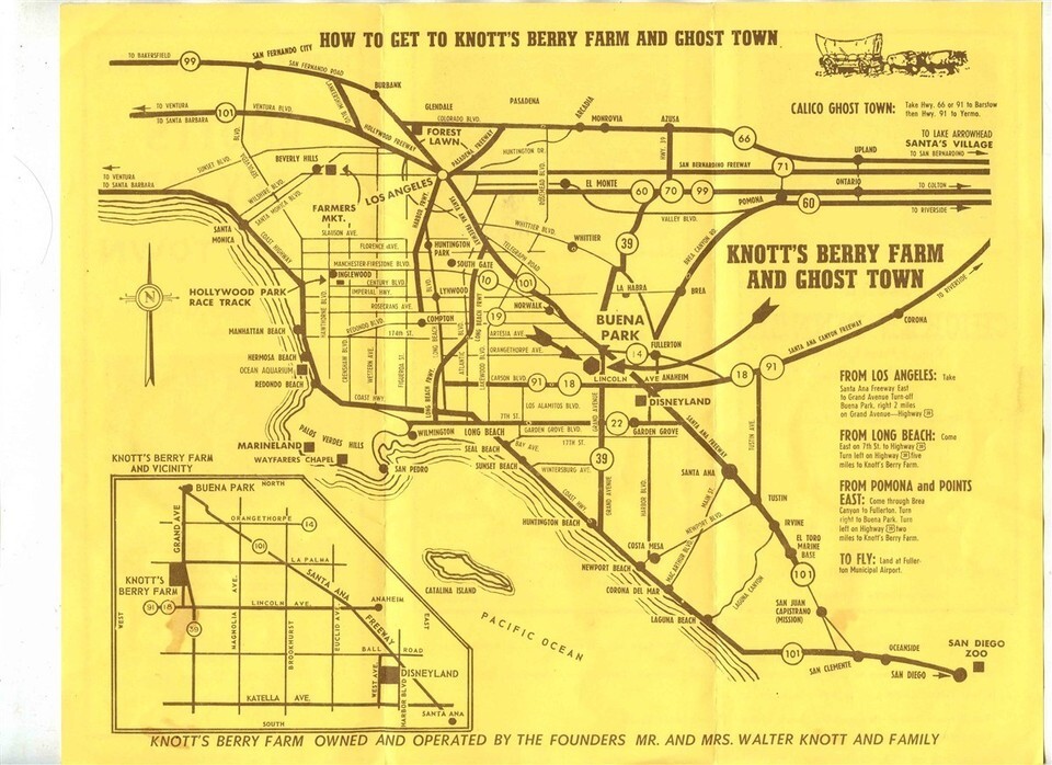 There are 2 items in this lot. from Knotts Berry Farm in Buena Park California. A Knotts Berry Farm Placemat and a 6 panel fold out with Menus for The Chicken Dinner and Steak House on one side and an area map on the other side.