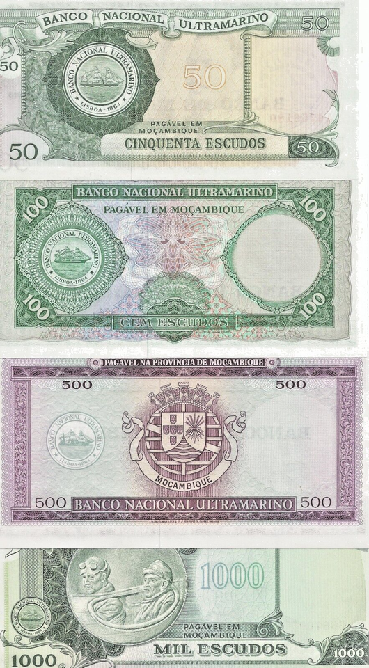 MOZAMBIQUE SET 4 NOTES 50 100 500 1,000 ESCUDOS P 116 117 118 119 UNC LARGE