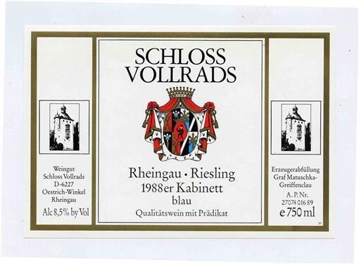 Schloss Vollrads Rheingau Reisling 1988er Kabinet Wine Label