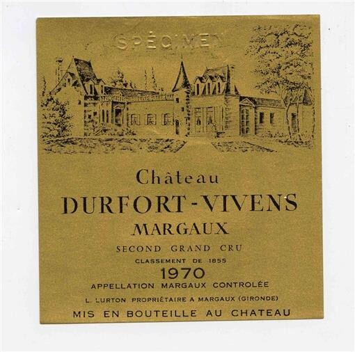 An original unused Wine Bottle Label from Chateau Durfort Vivens Margaux 1970 Measures about 5" x 4 1/2" Has SPECIMEN embossed in the label