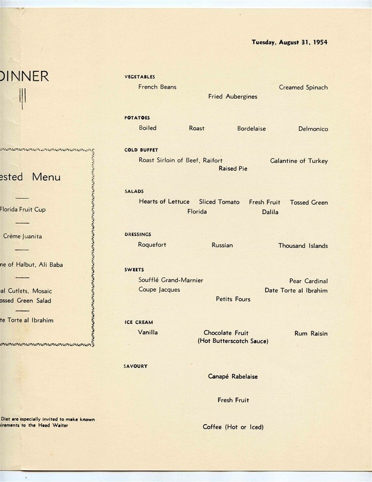A 4 page Dinner Menu from a R M S Caronia Cruise on August 31, 1954. With Sevres Inkstand Cover Measures about 8 1/4" x 10 1/2" when closed.
