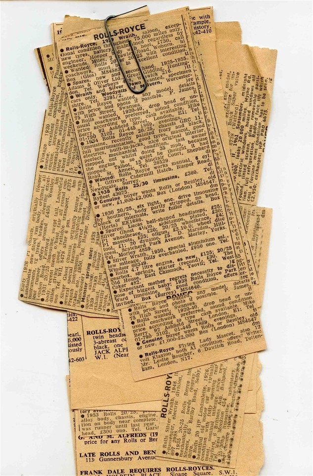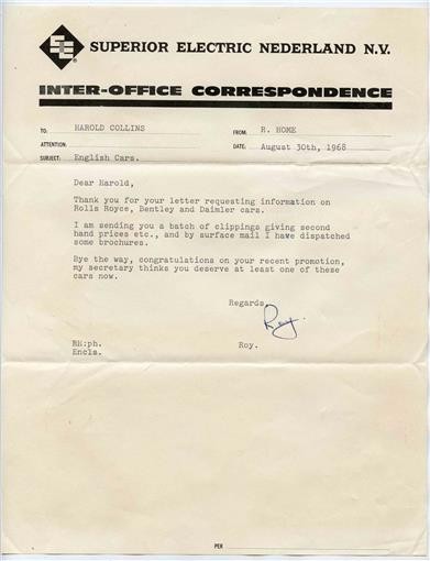 There is a letter and envelope in this lot. Plus about 12 newspaper classified ad clippings for Second Hand Rolls Royce Bentley Daimler automobiles.. A letter written on a Superior Electric Inter Office Correspondence sheet in 1968. Deals with Rolls Royce Bentley Daimler Used Cars Information