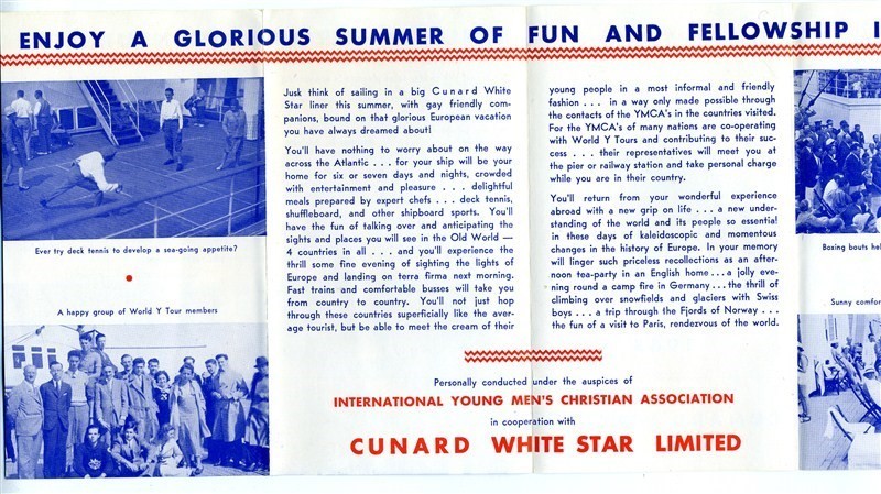 A well illustrated 8 panel fold out brochure on the 1935 Cunard White Star, World Y Tours to Europe on the Berengaria, Georgic and Majestic. In like new condition. Lots of photos and travel information. Has sample itinerary and fares. The YMCA, International Young Men's Christian Association.