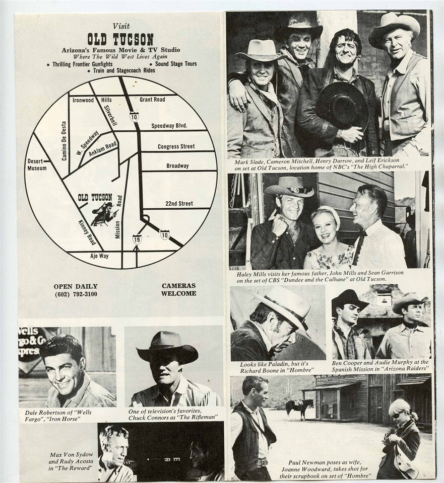 A 6 panel fold out brochure filled with photos of Movie and TV stars in Movies and TV Shows shot in The Old Tucson Movie Studio. Old Tucson Famous Movie Location and Studio Brochure. Includes photos of John Wayne, Dean Martin, Glenn Ford, Angie Dickinson, Alan Ladd, Paul Newman, Ernest Borgnine, Richard Boone Chuck Connors, and many more.