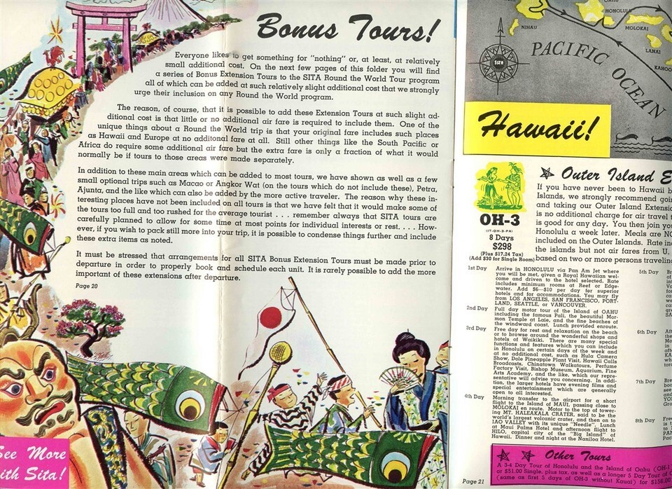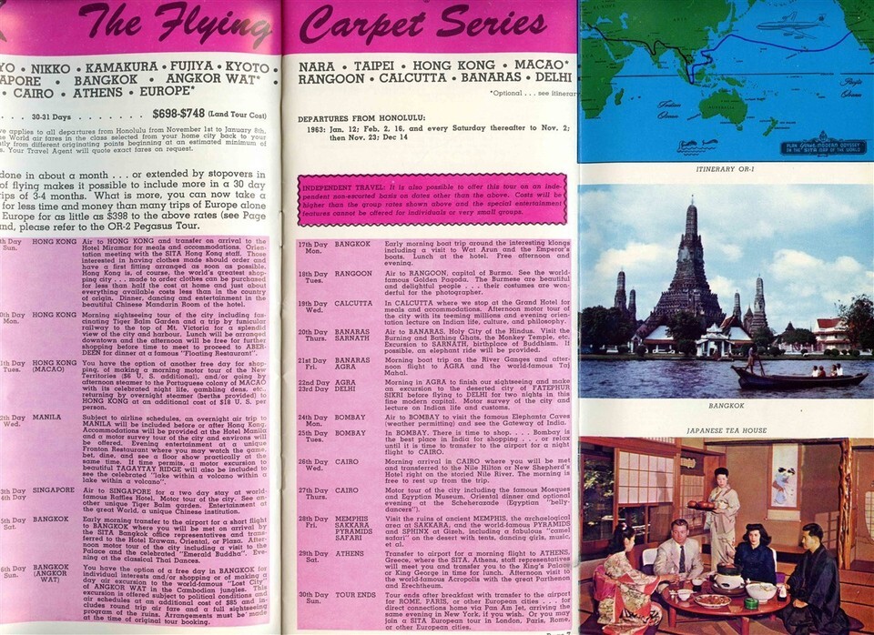 A full color 28 page brochure. CITA Pan American Around the World 1963 Brochure. Photos and detailed information on the tours offered. Includes Itineraries, Schedules, Fares and much more. Has map, Bonus and Extension Tour information and much more.