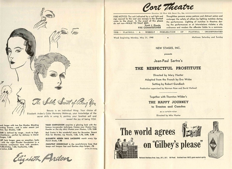 A Playbill for The Respectful Prostitute The Happy Journey at the Cort Theatre in New York City in 1948. Has Alan Ladd ad for Chesterfield on the back cover.