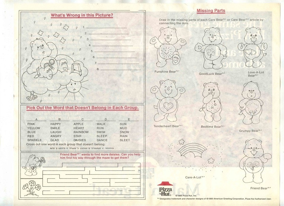 Pizza Hut Makin It Great Placemat Bear Puzzle Back 1988