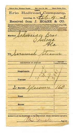 Erie Railroad Company 1903 Freight Receipt J Hoare Co Corning NY Glassware