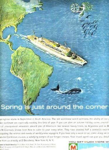 "An original ad from a 1960's magazine. The ad measures about 10 3/4"" x 13 1/2"" but due to the size limitations of my scanner only about 8 1/2"" x 12"" shows in the picture. Will ship in a tube by first class mail. An original magazine advertisement in excellent condition. " 1962 Moore McCormick Lines Spring is Just Around the Corner Magazine Ad