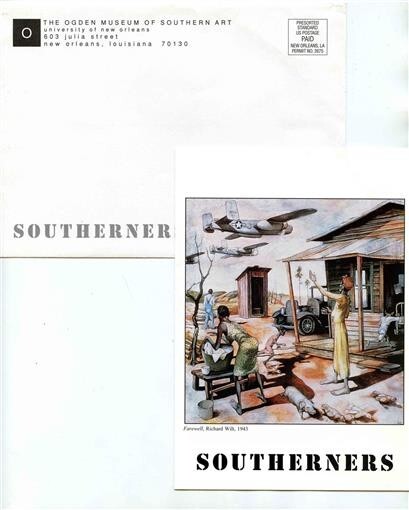 An illustrated 6 panel fold out on heavy slick paper and the original mailing envelope for an exhibition at The Ogden Museum Southern Art in New Orleans Louisiana in 2000. The Southerners with a list of artists and a few examples of the art. New Orleans LA