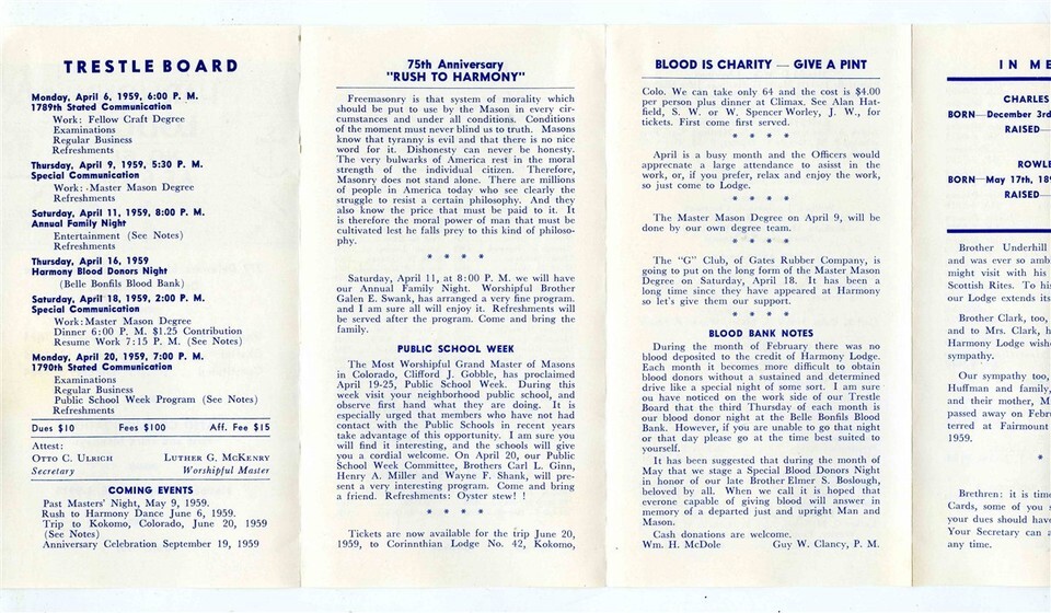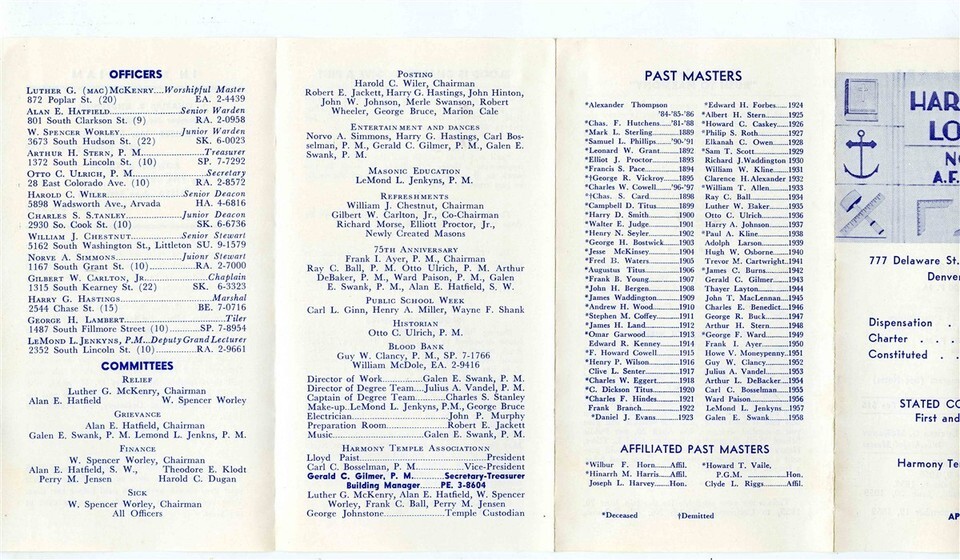 An 8 panel fold out brochure with Trestleboard, Officers, Committees, Past Masters and much more. Harmony Lodge No 61 A F A M Denver Colorado Brochure 1959