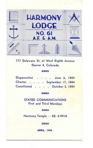 Harmony Lodge No 61 A F & A M Denver Colorado Brochure 1959