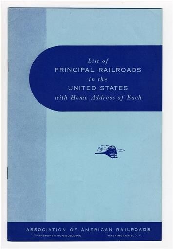 List of Principal Railroads in the United States with the home address of each. 8 pages in soft covers from the Association of American Railroads. Published in 1956. Information on 113 railroads.