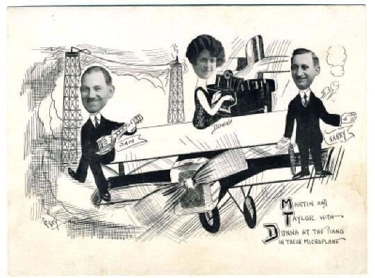 An original Sam Martin Harry Taylor Photo Advertising Card from the 1920s. Martin and Taylor were early radio stars. This caricature with face photos of the stars with their pianist Donna was drawn by Gary. In fine condition, measures about 7" x 5 1/4". The caption reads, Martin and Taylor with Donna on the Piano in their Microplane. Harry Taylor, the English Nightingale, and Sam Martin, the Ukelele Kid, accompanied at the piano by Mrs. Taylor