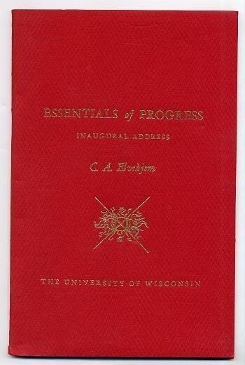 Essentials of Progress, the Inaugural Address of C. A. Elvehjem delivered at the University of Wisconsin on October 9, 1958. The University of Wisconsin Press, 28 pages in very fine condition in a gold lettered wrapper.