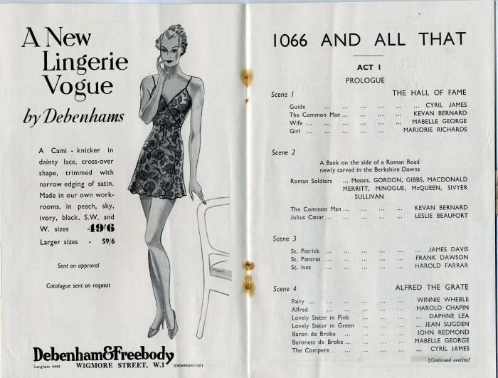 A program from the 1937 production of 1066 and All That, a musical comedy of English History in 27 Scenes. From the Cambridge Theatre in London. In very good condition with rusted staples.