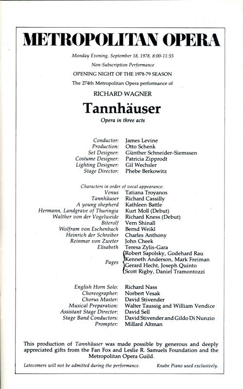 Metropolitan Opera Program Tannhauser Lincoln Center 1978 NYC Cassily Battle