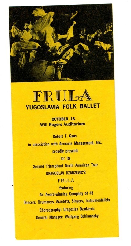 A 16 page well illustrated souvenir program and a 4 page program from a performance at The Will Rogers Auditorium in Fort Worth Texas of FRULA by the Yugoslav Folk Ensemble. Circa 1969