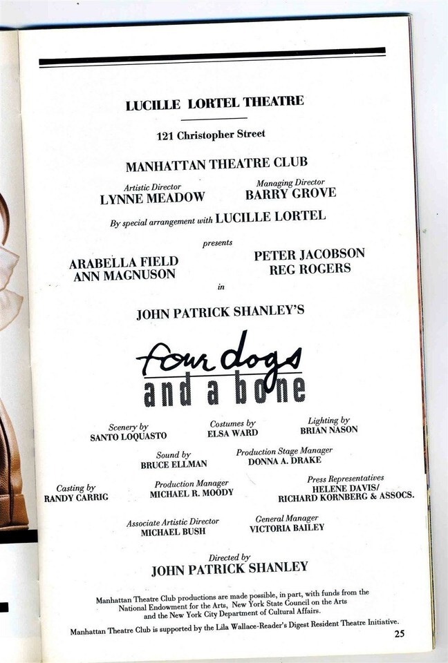 A Playbill for Four Dogs and a Bone from a performance in 1194 at the Lucille Lortel Theatre in New York City. In fine condition. Starring Peter Jacobson, Reg Rogers, Ann Magnuson and Arabelle Field