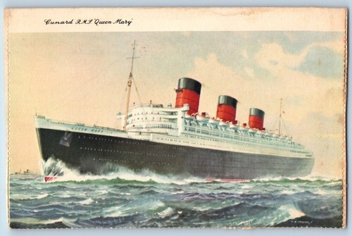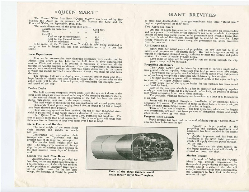 A 4 page Queen Mary Masterpiece in the Making Brochure. With illustrations and information on the experiments and construction of the Queen Mary . From the time after the launching in 1934 and the completion in 1936. Published by Cunard White Star. With Giant Brevities and picture comparing the size of the Queen Mary to Trafalgar Square in London. Measures about 5" x 8" when closed.