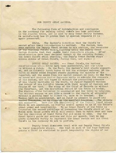 A 2 page guide, has been folded. For Deputy Great Sachems Form of Introduction Conclusion Ceremony Raising Tribal Chiefs. History , procedures and information and the ceremony.