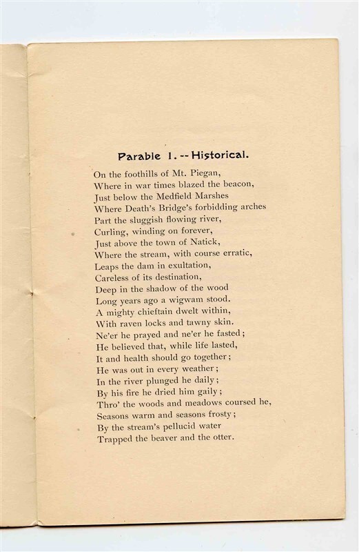 A 12 page booklet with paper covers. Pokanoket Parables In Memoriam April 28 -29 AD , 1900 . Parable 1 is Historical , Parable 2 is Allegorical and Parable 3 is Diabolical . Measures about 4 1/2" x 7" when closed.