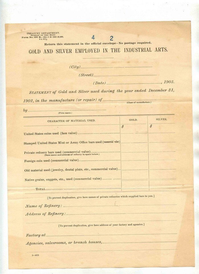 There are 2 single pages in this lot. A Treasury Department Bureau of the Mint Letter dated 1903 from Geo, E Roberts, Director of the Mint consumers of Gold and Silver in Gold Silver manufacturing. There is a blank Treasury form on Gold and Silver Employed in the Industrial Arts It has not been filled in. These are both originals,