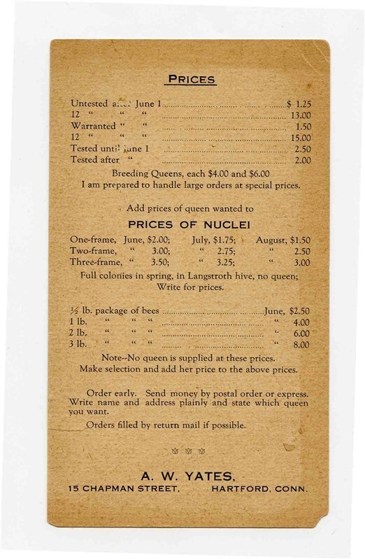 A 2 sided advertising card from the 1910-1920's. A Nutmeg Italian Queens Bees Advertising Card with pricing for tested and untested Queens and Frames of Nuclei and for packages of Bees, From the A W Yates Company of Hartford Connecticut. Measures about 3 1/2" x 6".