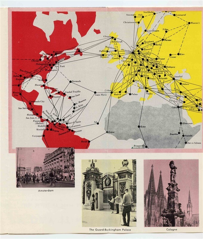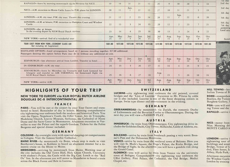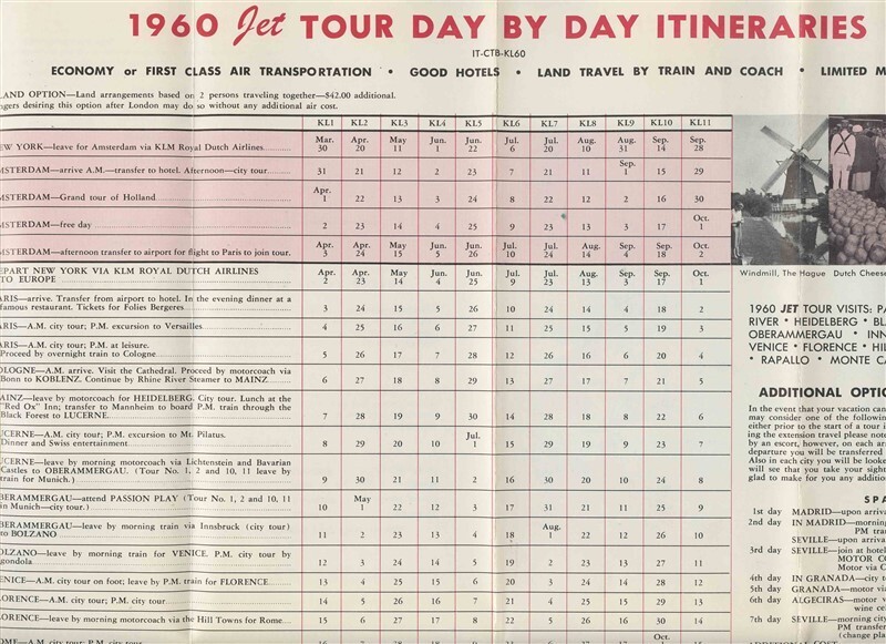 A 16 panel fold out printed on slick heavy paper. KLM Royal Dutch Airlines Escorted Jet Tours to Europe Brochure for 1960. Includes A detailed Worldwide route map, Airline, travel planning, hotel and tour information, detailed itineraries, tour dates, extensions and more. All on a KLM DC-8 Intercontinental Jet
