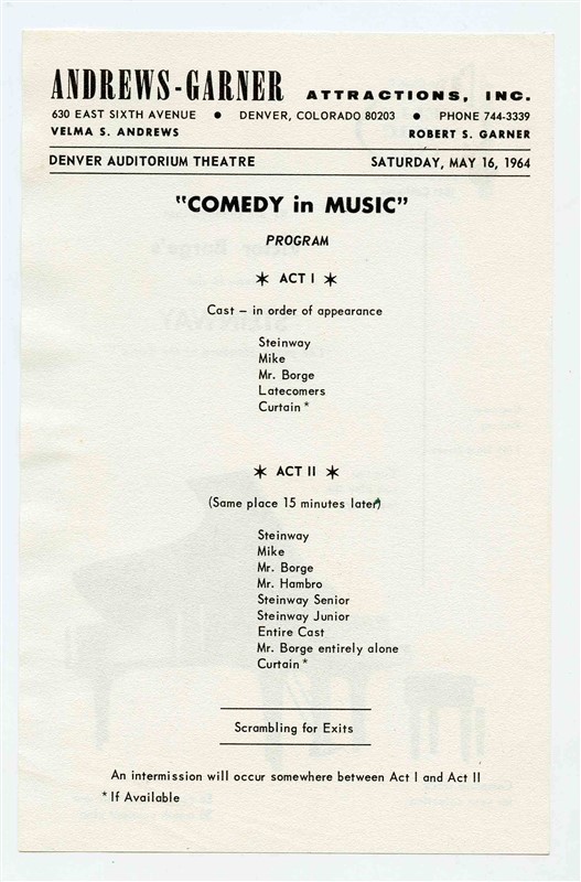 A program and souvenir program from a performance of Comedy in Music as presented at the Denver Auditorium Theatre in Denver Colorado on May 16, 1964. A 2 sided single page program and a 26 page souvenir program filled with photos and information on Victor Borge. Has stains on back cover from removal from a scrap book. Victor Borge Souvenir Program Program Denver Auditorium Theatre May 1964