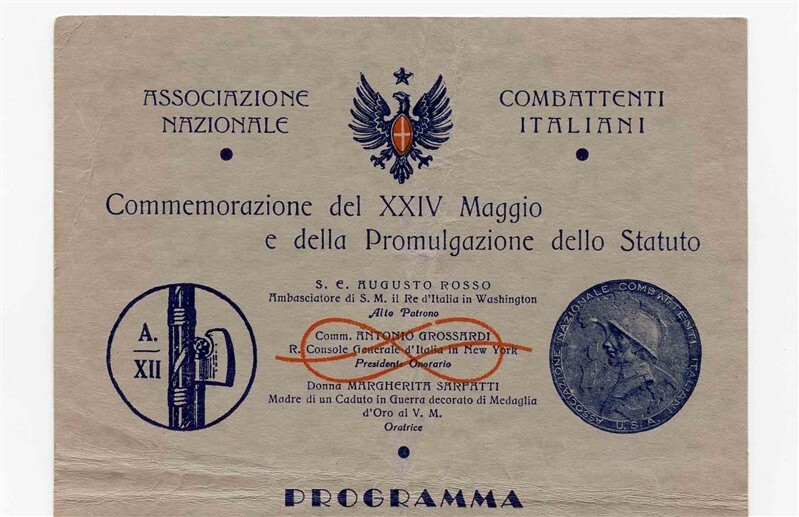 national Italian fighters association, associazione nazionale combattenti italiani. Commemoration of the XXIV May and of the Promulgation of the Statute Program. A single page program in Italian. With Dance and Commemoration. Measures about 5 3/4" x 8" and the back is blank. Has been folded, Held at the Armory on W 62nd Street in New York City