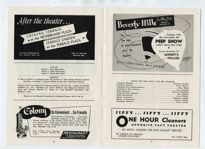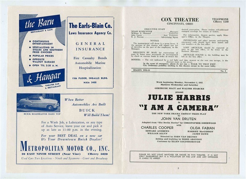 Cox Theatre Program Julie Harris I Am Camera 1952 Cincinnati Ohio