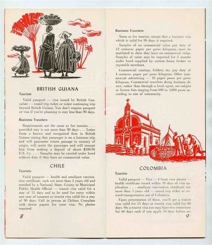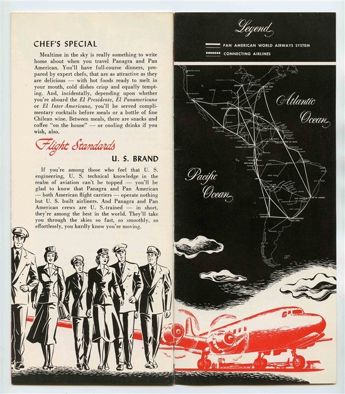 A 24 page illustrated booklet. Pan American World Airways and Pan American Grace Airways ( Panagra) South America Booklet . Lots of pictures and Traverlers Facts about the South American Countries served. A Helpful Guidebook for Tourists and Business Travelers. With Route Map, Flight Standards, In Flight Meals and more. Circa 1960's.