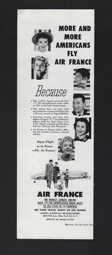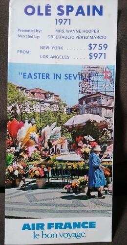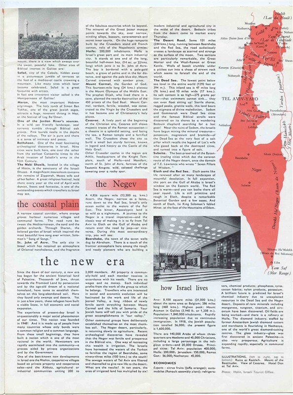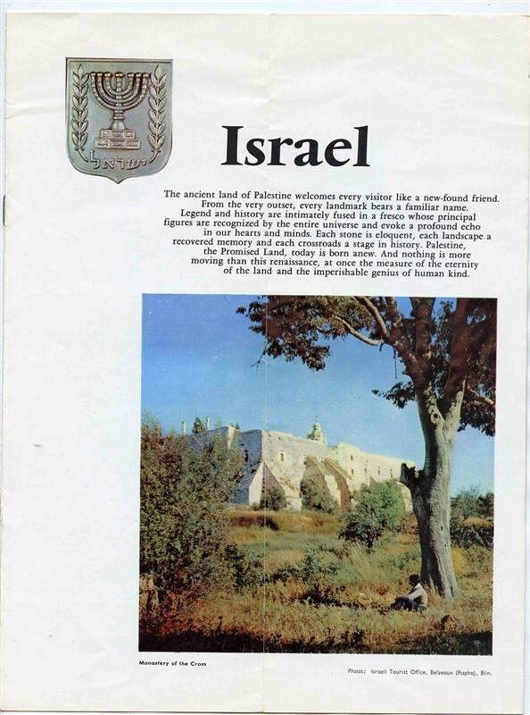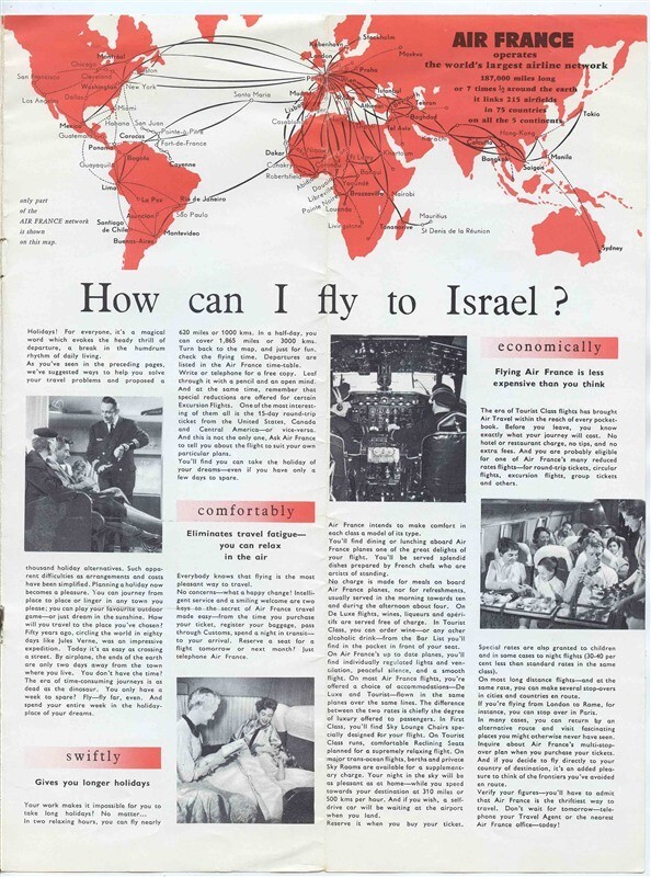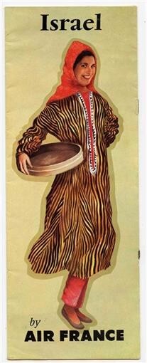A 1957 brochure with 8 large pages filled with color and black white photos. LOts of historical and tourist information, With Israel Map, Air France Route map and more. Plus Air France travel information . What to do and see and how much it will cost. In good condition, .