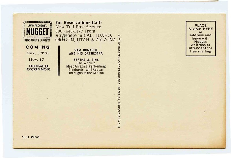 Juliet Prowse Circus Room John Ascuaga's Nugget Casino Postcard Sparks Nevada