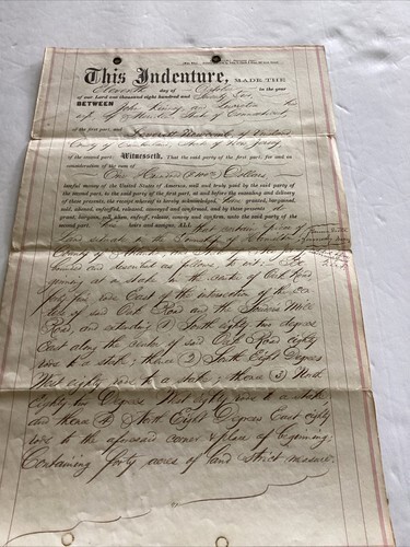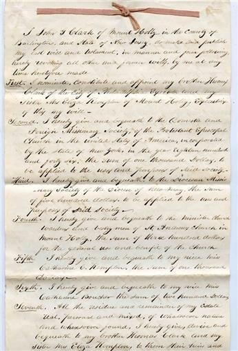 A 4 page hand written document with ribbon biding, John G Clark Hand Written Sealed Will . Dated 1853 in Burlington County New Jersey . Nice large Seal and interesting signatures. Pages measure about 7 5/8" x 12 1/4". Is now. Folded.