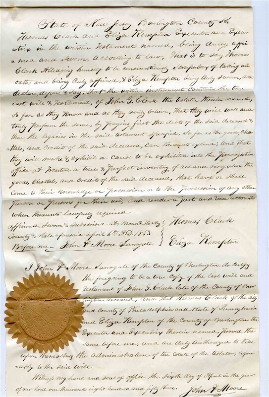 John G Clark Hand Written & Sealed Will 1853 Burlington County New Jersey